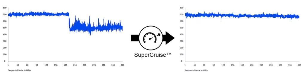 SuperCruise™ - Ciągły zapis danych o dużej objętości, jak w przypadku nagrywania wideo, może skutkować nagłym spadkiem wydajności lub przerwą w zapisie. Technologia marki Exascend eliminuje ten problem, gwarantując niezrównaną stabilność nawet podczas najbardziej wymagających zastosowań. W odróżnieniu od wielu systemów konkurencyjnych marek, których wydajność zachowana jest tylko na początkowym etapie zapisu, unikalny algorytm SuperCruise™ odpowiada za to, żeby parametry nośnika danych zostały zachowane aż do zakończenia pracy.