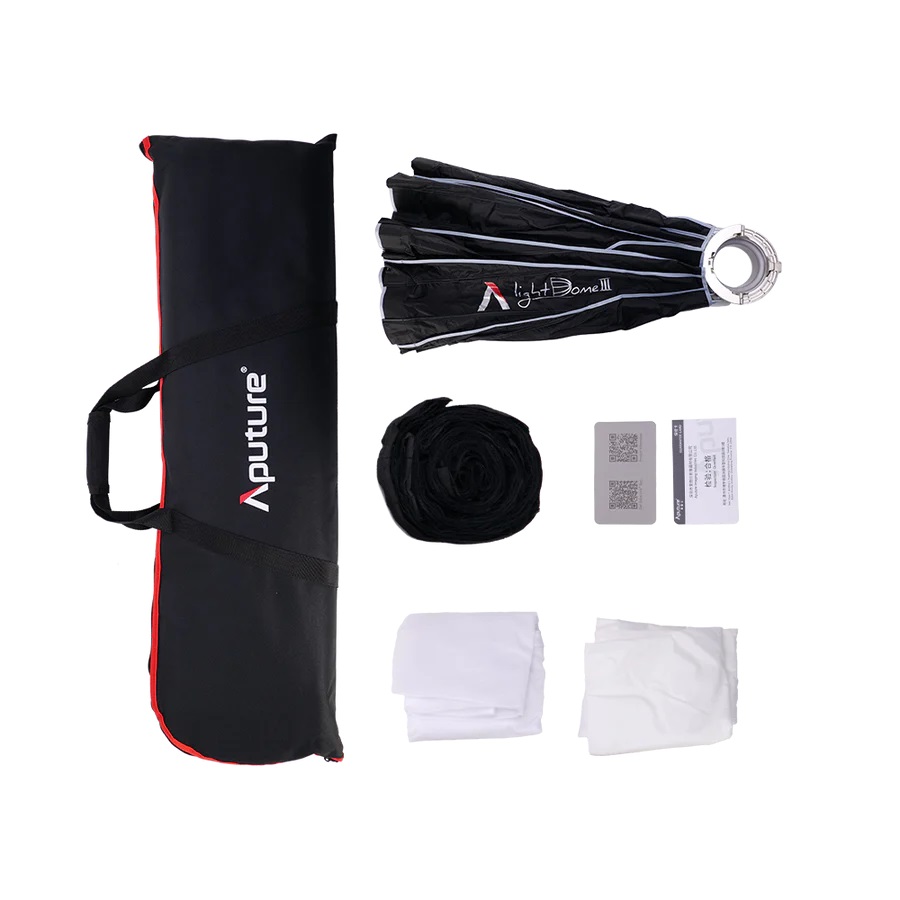 W zestawie znajduje się softbox Aputure Light Dome III, dwie tkaniny dyfuzyjne (1 Stop i 2 Stop), grid i torba transportowa.