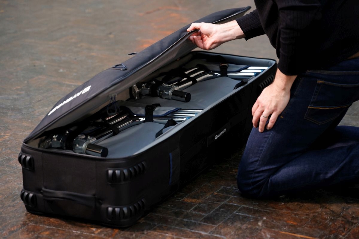 Specjalne mini przegrody oddzielają od siebie głowiczki statywów tak, aby nie obijały się o siebie podczas transportu.
